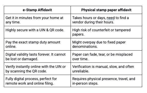 The quickest and most striking point of comparison that differentiates the two is that an e-stamped affidavit is faster and safer to get, while a physical one is slower and has fraud risk.