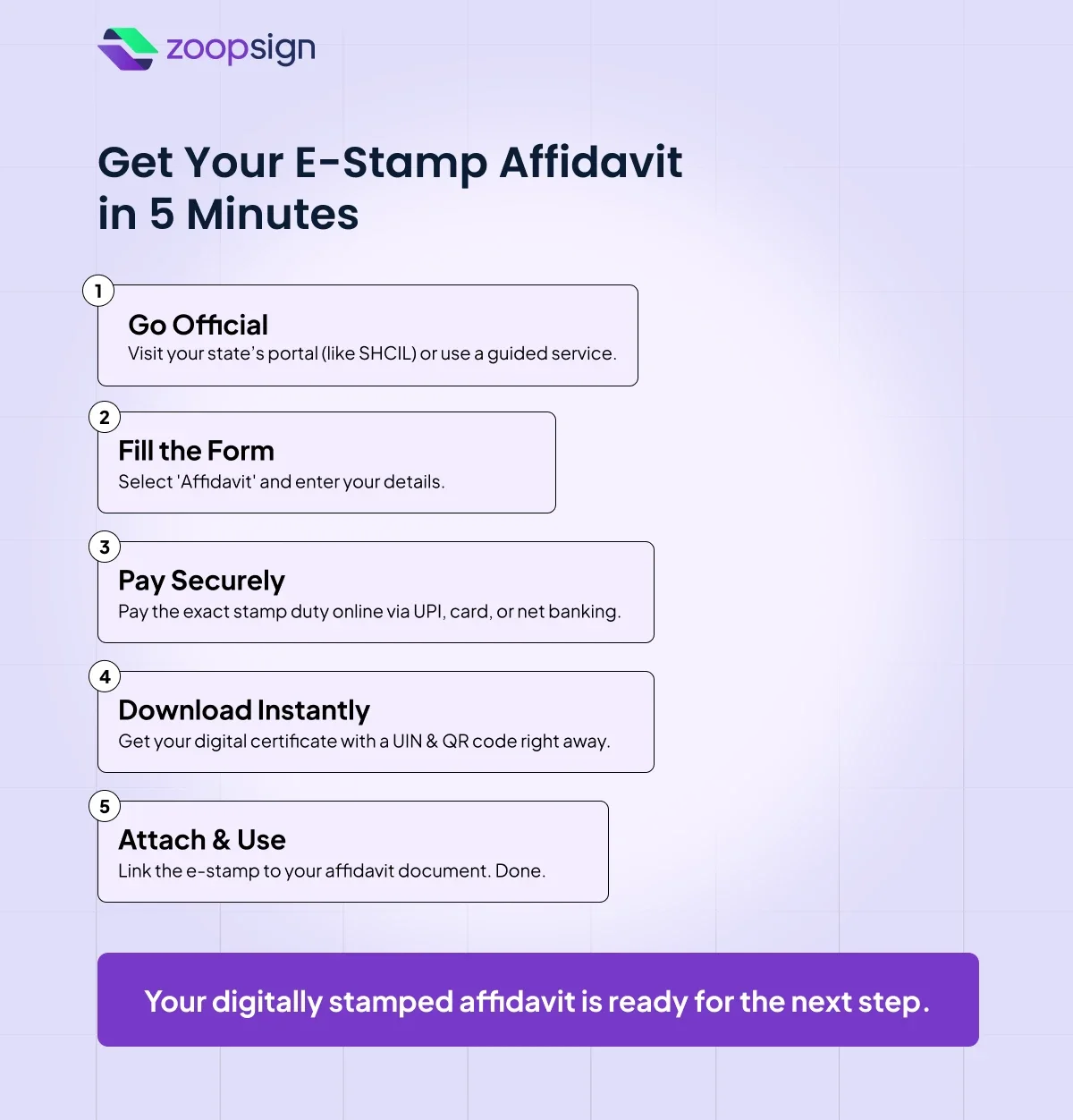 You can verify an e-stamped affidavit in under a minute by entering its UIN number and date on the SHCIL website, or by scanning its QR code. ZoopSign’s eStamps include a unique identification number for security and verification