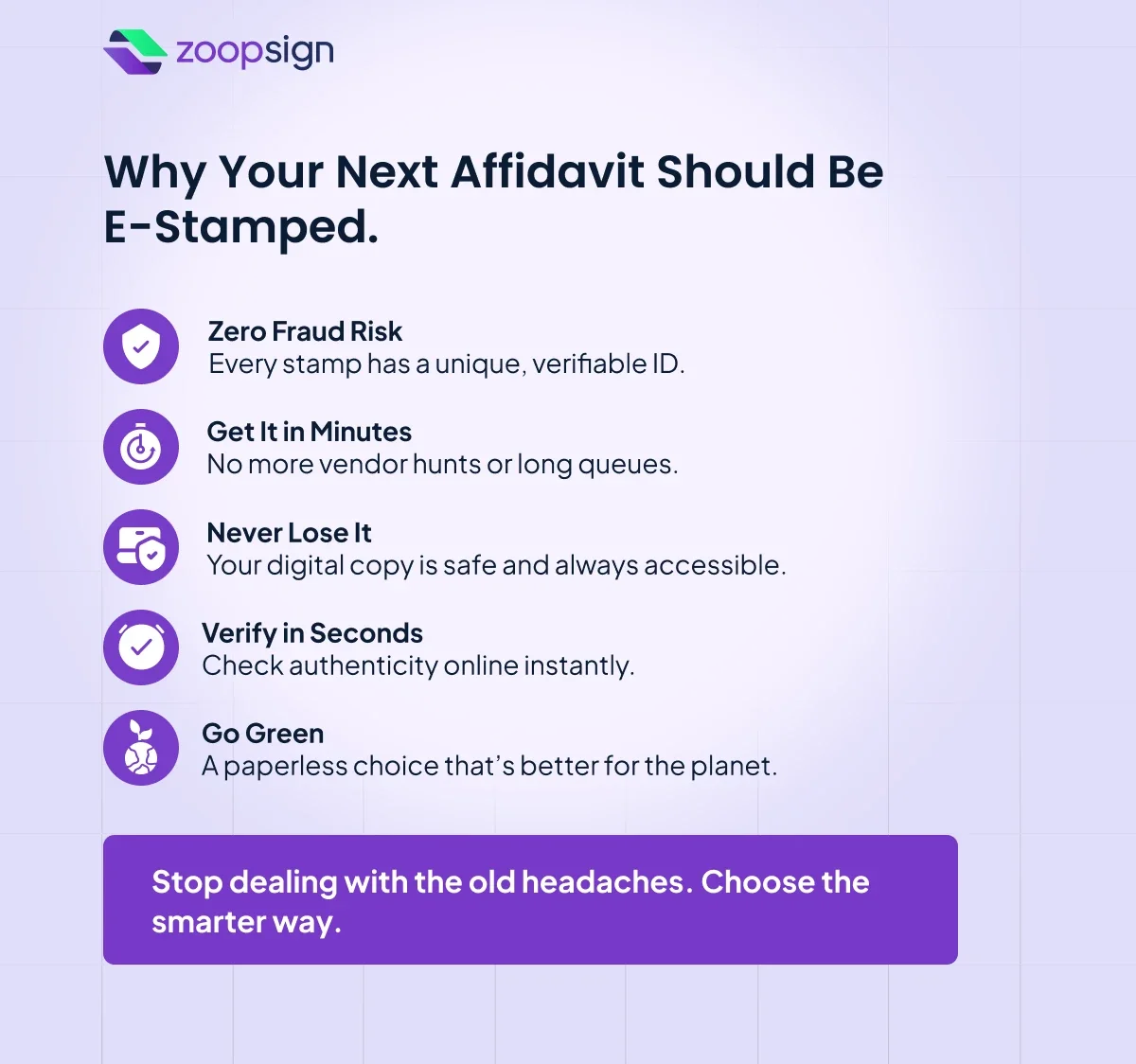 Because it is obviously the better choice. It's faster, safer, and much easier than dealing with physical stamp paper. Getting your affidavit stamped the old way, while still very much valid, comes with outdated problems that the digital method was designed to fix in the first place. For secure signing after stamping, use ZoopSign electronic signatures.