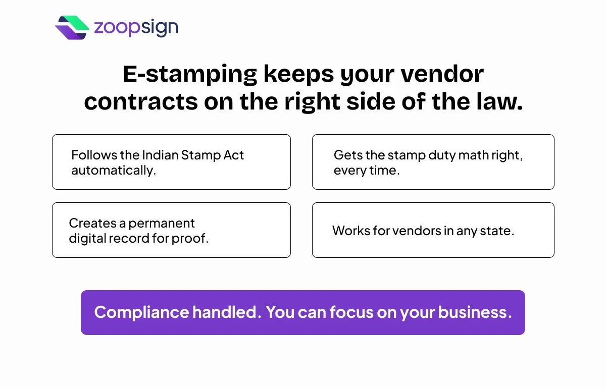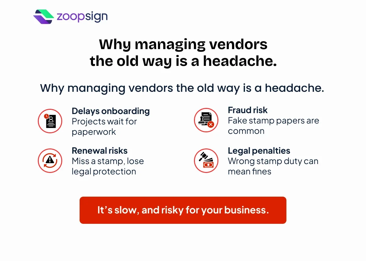 Managing vendors doesn't have to be slow or risky, like it once used to. The old way of using physical stamp paper creates delays and opens your business to legal problems.